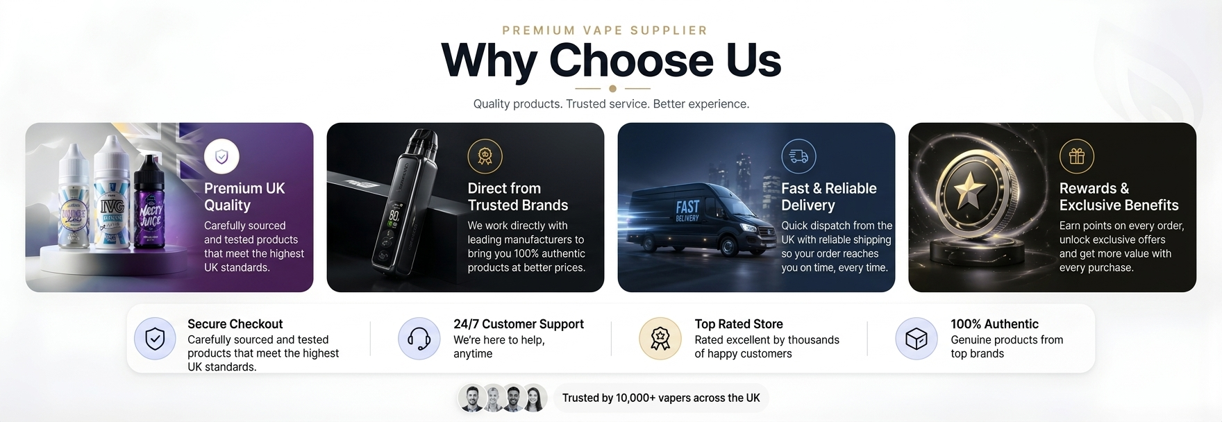 Our passion for vaping drives us to provide the best experience possible for our customers. Whether you’re new to vaping or a seasoned pro, we’re here to help you find the right disposable vapes, nicotine pouches, tanks, and pods to suit your preferences. We work directly with the world’s top manufacturers, ensuring that every product we offer is of the highest standard.